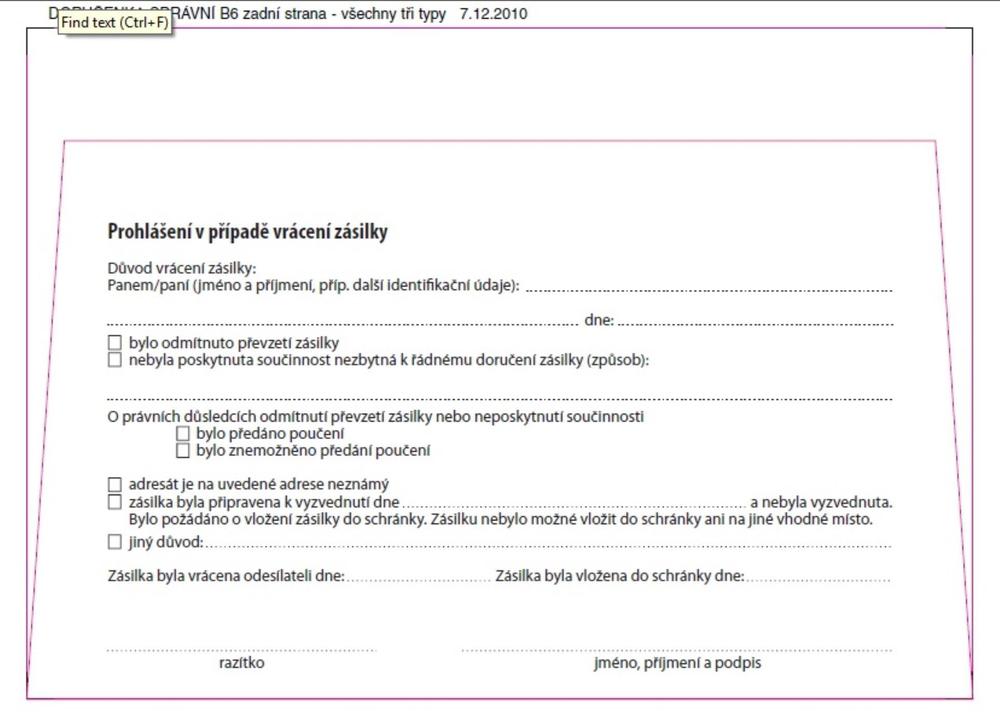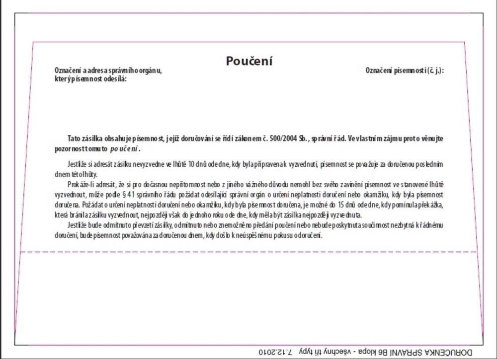 - Obálka s vytrhávací doručenkou a odtrhávacím poučením dle zákona č.500/2004 Sb.