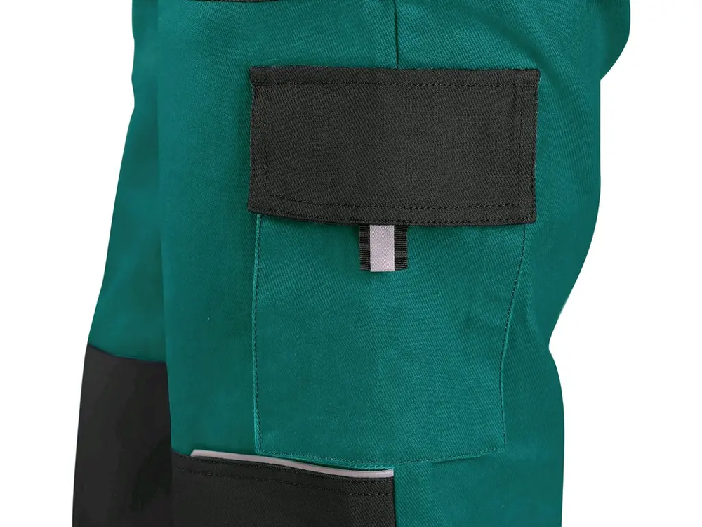 - Zdvojená kolena, přední našité kapsy, náprsní kapsa na zip