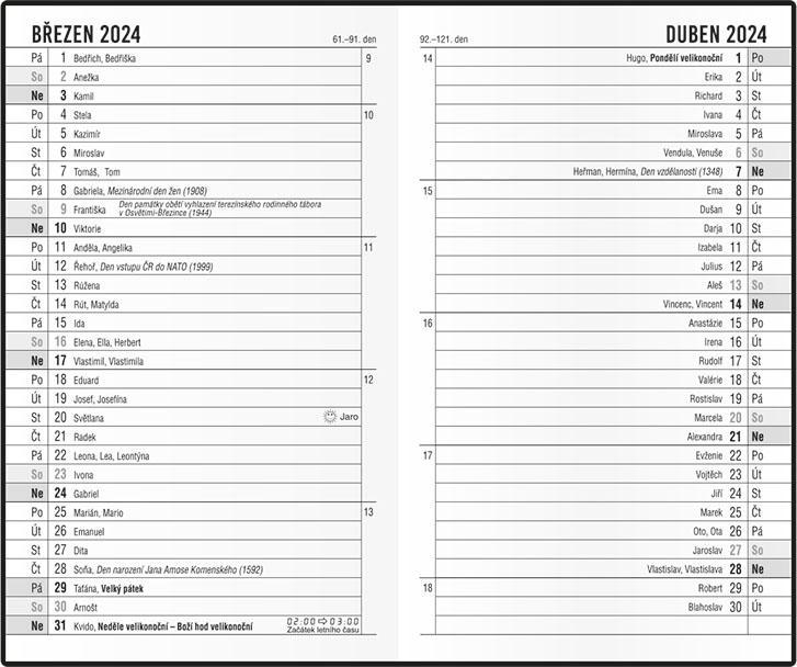 osobní záznamy, důležitá telefonní čísla, tabulkový kalendář aktuálního roku, roční plánovací kalendář aktuálního roku, jmenný seznam, adresář, místo na zapsání odjezdů a příjezdů, velký prostor na poznámky