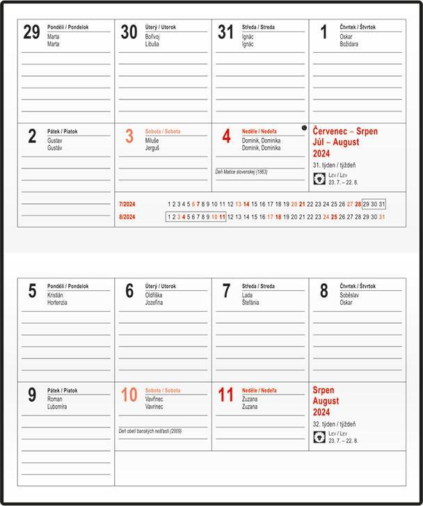osobní záznamy, důležitá telefonní čísla, čtvrtletní plánovací kalendář aktuálního roku CZ/SK, roční plánovací kalendář aktuálního roku CZ/SK, tabulkový kalendář následujícího roku CZ/SK, jmenný seznam CZ/SK, místo na poznámky