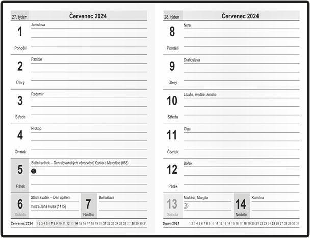 Jednoduchý a praktický týdenní diář vyrobený z jemného hladkého materiálu s polomatným povrchem černé barvy. Ideální pro každého, kdo si oblíbil měkkou šitou vazbu.