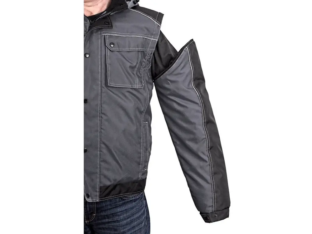 - Odepínací kapuce a rukávy, regulovatelné manžety na rukávech, plastové poutko