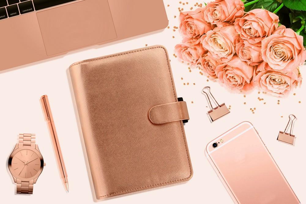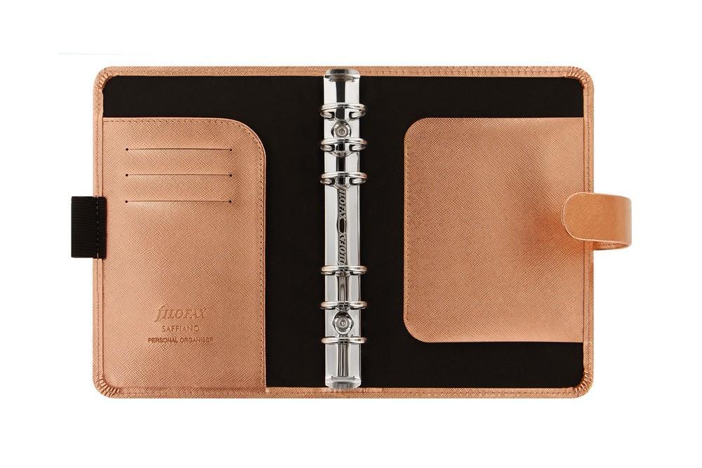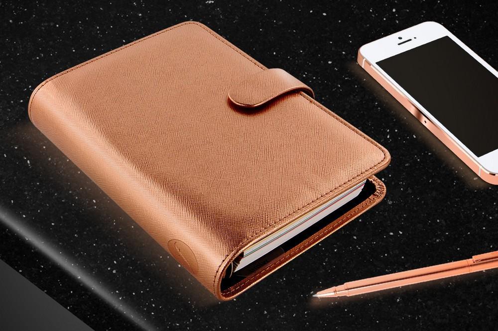 Okouzlující diář z limitované edice v módní barvě růžového zlata. Desky s úpravou saffiano jsou doplněny kontrastní černou vnitřní částí. Zavírání pomocí přezky se skrytým patentem.