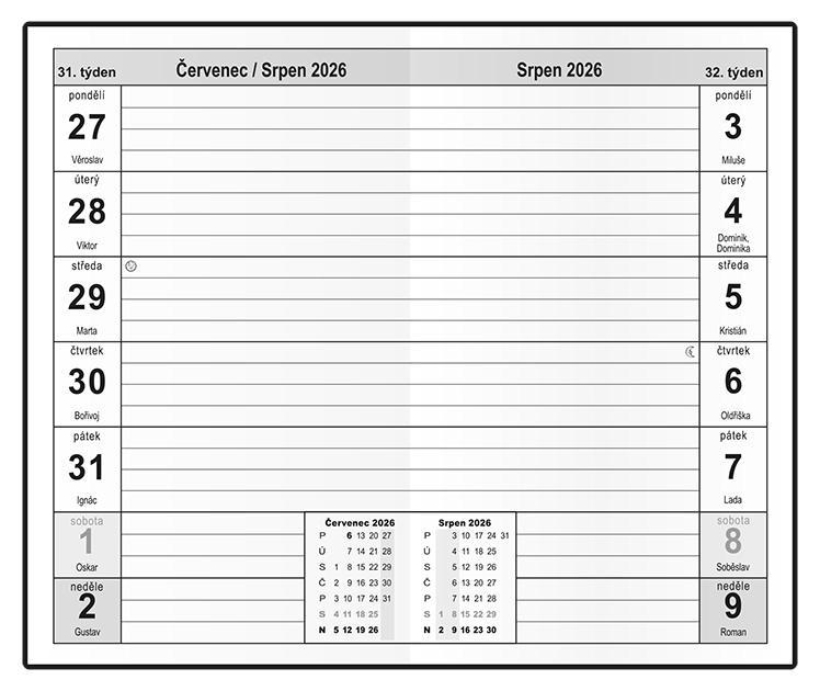 osobní záznamy, důležitá telefonní čísla, čtvrtletní plánovací kalendář aktuálního roku, tabulkový kalendář následujícího roku, jmenný seznam, místo na poznámky, roční plánovací kalendář aktuálního roku