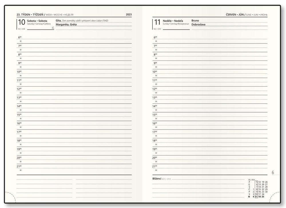 Originální denní diář s přírodním motivem dřeva a ražbou je vyráběný z jemně strukturovaného materiálu s efektním výsekem uvnitř. Má velký prostor pro poznámky a plánování. Výjimečností tohoto diáře je, že soboty i neděle jsou na každé stránce zvlášť.