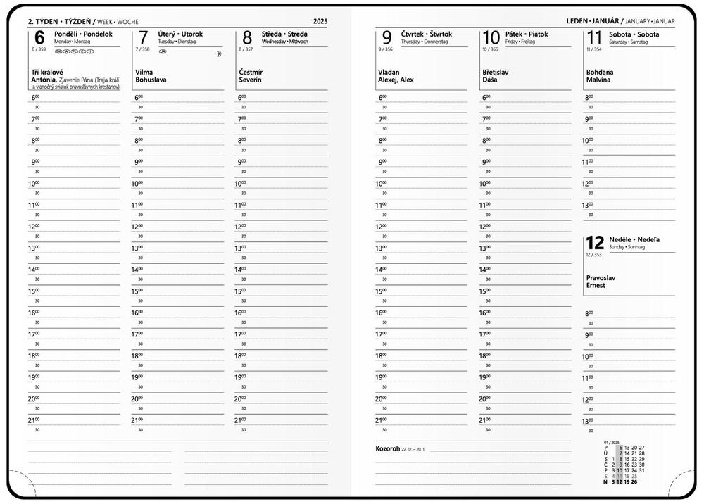 osobní údaje, přehledný kalendář aktuálního roku a následujícího roku, měsíční plánování aktuálního roku, plán dovolených aktuálního roku, přehled státních svátků a významných dnů CZ/SK, jmenný seznam CZ/SK, daňový kalendář CZ/SK aktuálního roku, mezinárodní svátky, důležitá telefonní čísla, roční plánovací kalendář CZ/SK aktuálního roku, místo pro poznámky, mapa CZ/SK, zadní předsádka - kapsa