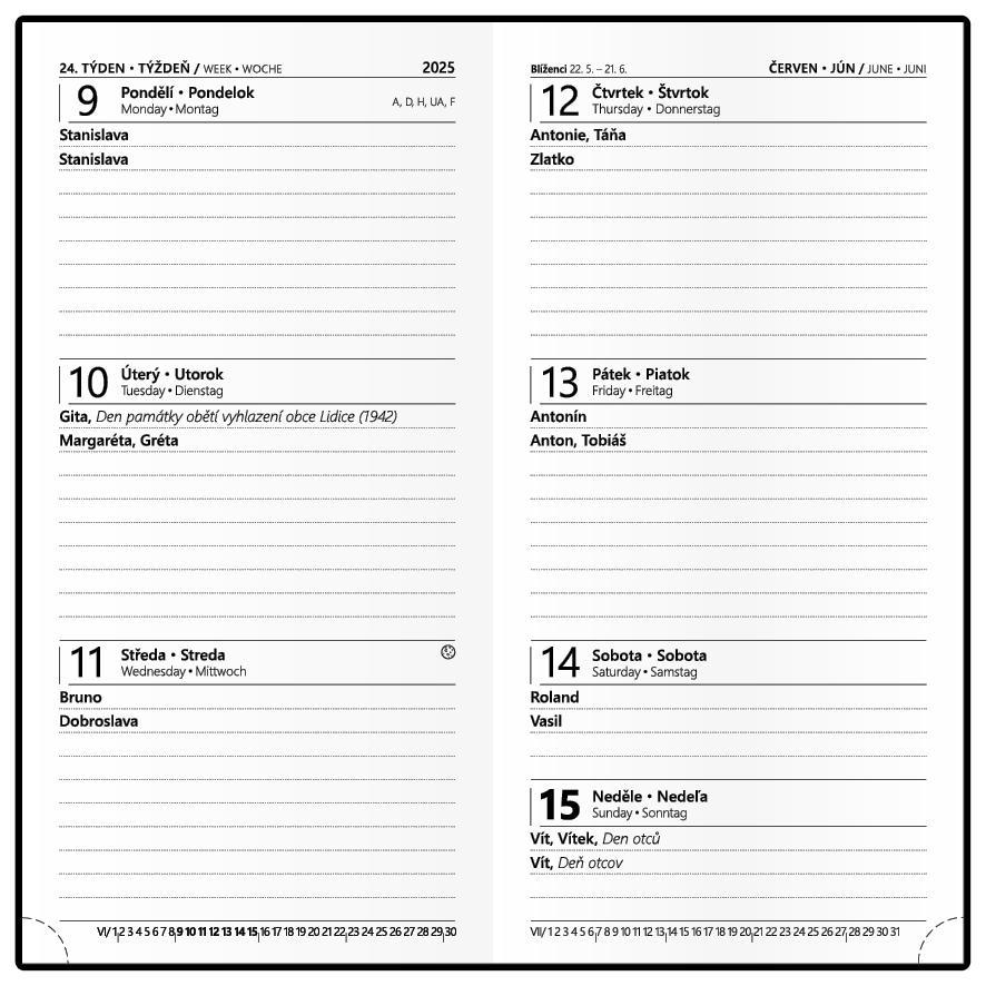 osobní údaje, přehledný kalendář aktuálního roku a následujícího roku, měsíční plánování aktuálního roku, plán dovolených aktuálního roku, jmenný seznam CZ/SK, mezinárodní svátky, roční plánovací kalendář CZ aktuálního roku, místo pro poznámky