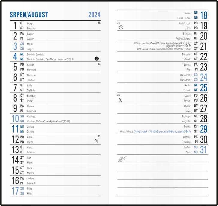 osobní záznamy, důležitá telefonní čísla, roční plánovací kalendář aktuálního roku CZ/SK, tabulkový kalendář následujícího roku CZ/SK, místo na poznámky