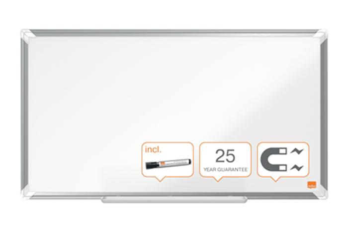 Smaltovaná magnetická tabule v širokoúhlém formátu s moderním stylovým hliníkovým rámem. Upevnění v rozích do zdi, obsahuje prostornou přihrádku na popisovače a stěrku. Magnetický smaltovaný povrch s vynikající odolností a mazatelností je vhodný pro časté používání. Velikost: 710 x 400 mm. Dodáváno s popisovačem Nobo. Záruka na povrch 25 let. Rozměry: 728 x 418 x 17 mm