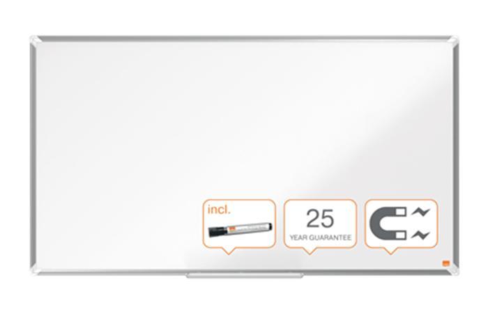 Smaltovaná magnetická tabule v širokoúhlém formátu s moderním stylovým hliníkovým rámem. Upevnění v rozích do zdi, obsahuje prostornou přihrádku na popisovače a stěrku. Magnetický smaltovaný povrch s vynikající odolností a mazatelností je vhodný pro časté používání. Velikost: 1220 x 690 mm. Dodáváno s popisovačem Nobo. Záruka na povrch 25 let. Rozměry: 1236 x 705 x 17 mm