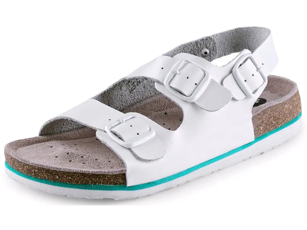 - Obuv korkový sandá dámský, kožený se zdravotní anatomickou stélkou, se dvěma nártními pásky a páskem kolem paty, barva bílá
