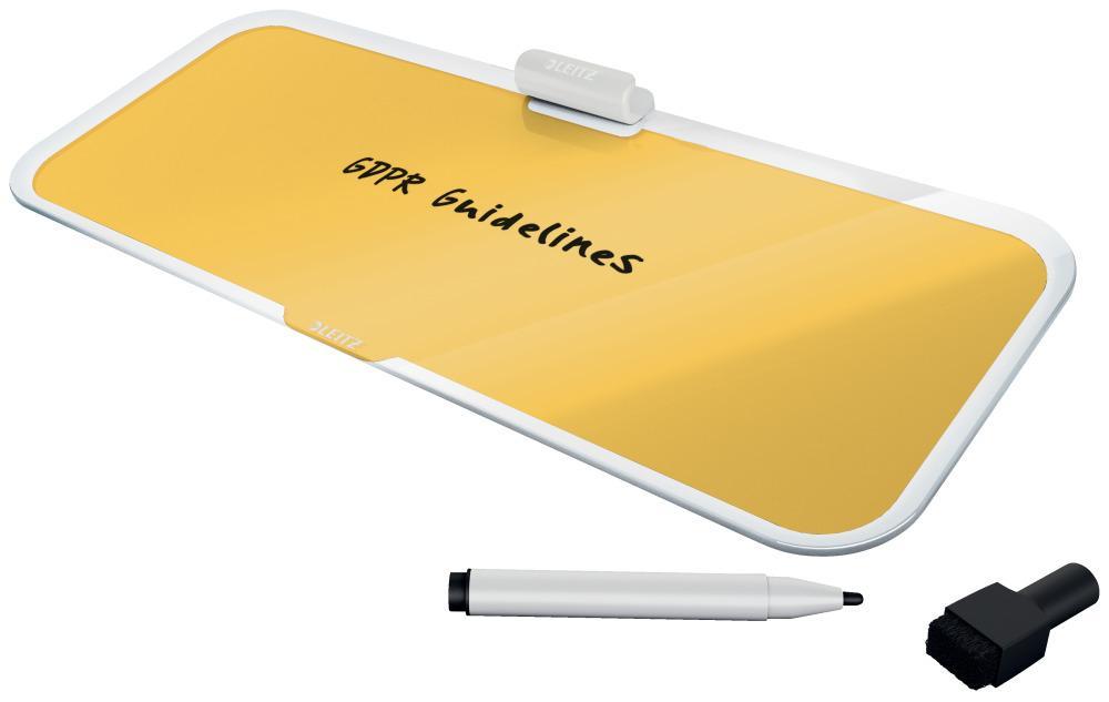 Značková řada Leitz Cosy vám umožní cítit se jako doma, ať už vás váš pracovní den zavede kamkoli. Díky minimalistickému designu a příjemným barvám můžete do svého pracovního prostoru přidat styl a barvu. Skleněná stolní tabulka Leitz Cosy je unikátní nástroj pro opakované psaní poznámek, suchým popisovačem jednoduše napíšete důležité infomace, kdykoliv otřete a můžete psát znovu. Tato skleněná tabulka prvotřídní kvality je perfektním doplňkem vašeho domova nebo kanceláře. Co si napíšete, nezapomenete, protože máte stále před očima, a můžete v klidu pracovat na dalších úkolech.