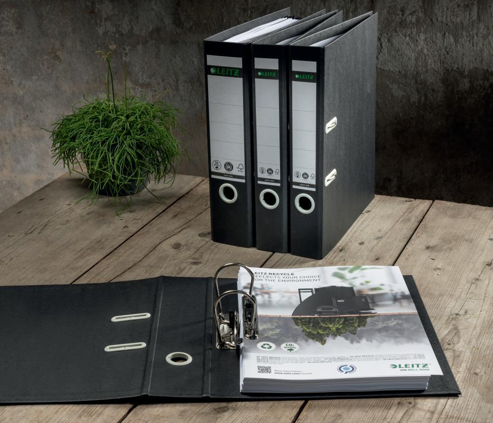 Pákový pořadač nejvyšší kvality v přitažlivém designu. Při likvidaci je možné rozebrat jednotlivé komponenty a opět je recyklovat. šíře hřbetu 50 mm, pro formát A4 Bez uhlíkové stopy, 100% recyklovatelný, s ekologickou certifikací FSC a Blue Angel. Tento odolný pákový pořadač výtečně zapadá mezi ostatní ekologické výrobky značky Leitz. Moderní a ekologické kancelářské výrobky vypadají dobře nejen v klasické kanceláři, ale i doma. S novými ekologickými výrobky společnosti Leitz můžete nejen vylepšit své pracovní prostředí, ale také přispět ke zlepšení prostředí naší planety.