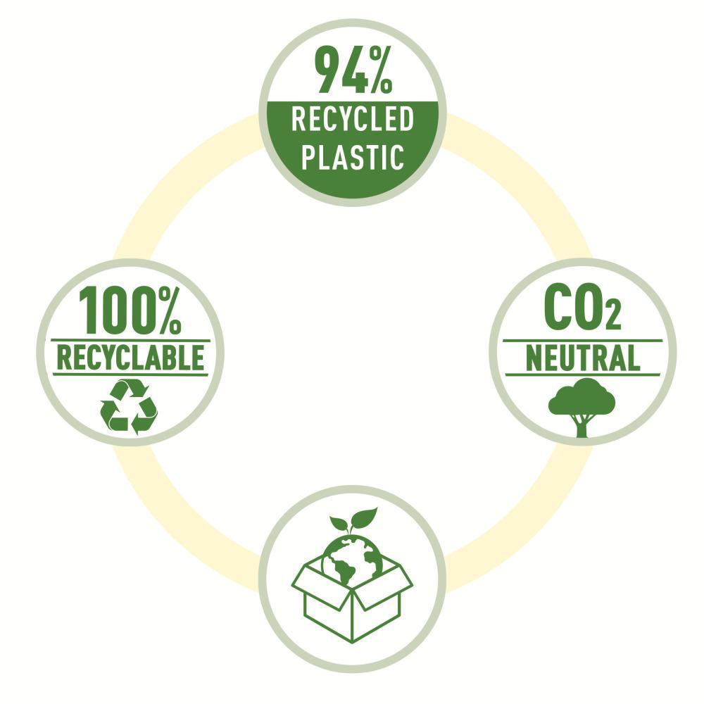- Vyrobeno z 94% recyklovaného (PCR) plastu, CO2 neutrální