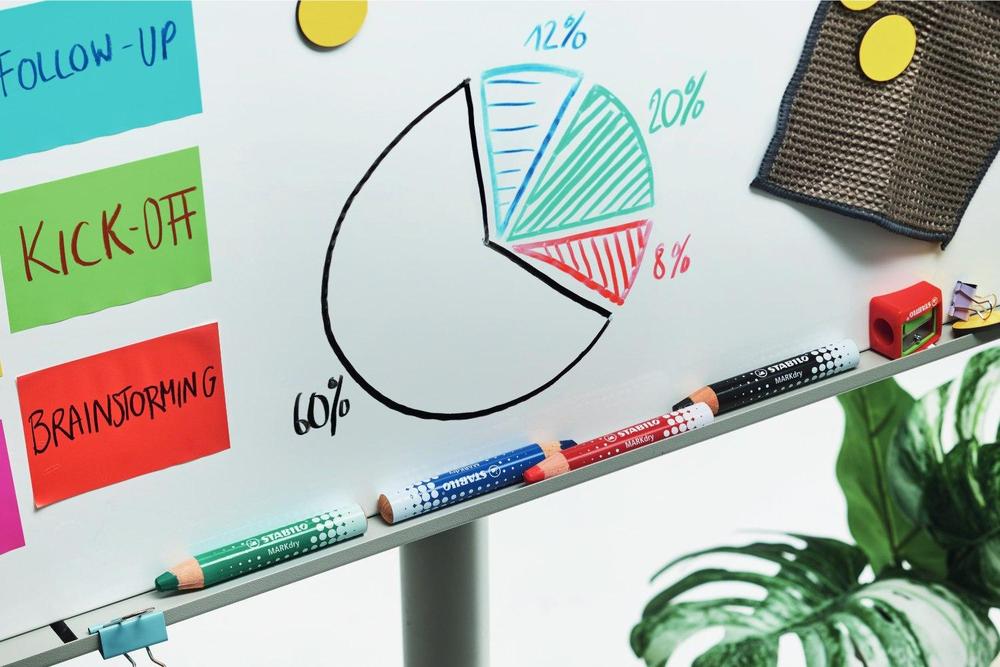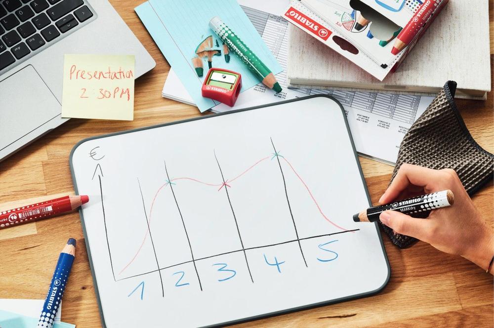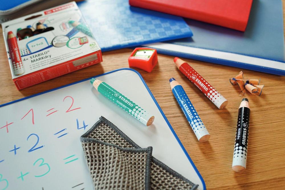 STABILO MARKdry je suchý popisovač se silnou barevnou tuhou na bílé tabule a flipcharty. Píše na papír a hladké povrchy, ze kterých jej lze také otřít nasucho nebo namokro bez zanechání stop. Díky robustní XXL tuze s bohatým tahem zůstává barva intenzivní až do posledního tahu.