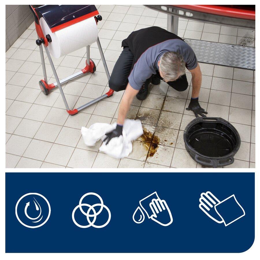 Zvolte papír, který zvládne širokou škálu úkolů – náš 2-vrstvý Tork Wiping Paper Plus je ideální pro každodenní úkoly, jako je sušení rukou a otírání lehce znečištěných povrchů. S jeho vysokou absorpční schopností se snadno vypořádáte i s rozlitými tekutinami. Papír je snadno dostupný prostřednictvím našich bezpečných dávkovačů Tork Floor nebo Wall Stand Dispensers. Jejich jednoduché nahrávání a trhací funkce zajišťují spolehlivý způsob dávkování, přičemž systém pro použití jednou rukou umožňuje vysokou efektivitu.