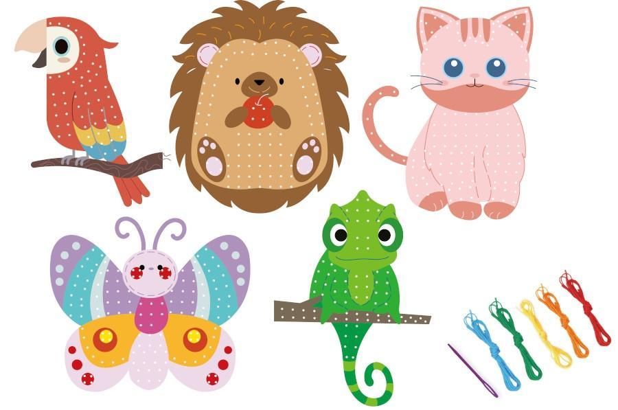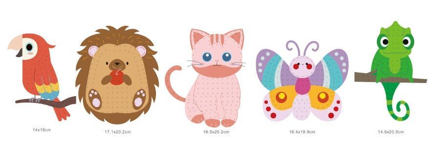- Sada pro dětské vyšívání zahrnuje 5 roztomilých motivů zvířátek (ježka, motýla, papouška, kočičku a chameleona), 5 barevných bavlnek (červenou, zelenou, žlutou, oranžovou a světle modrou) a jednu plastovou jehlu