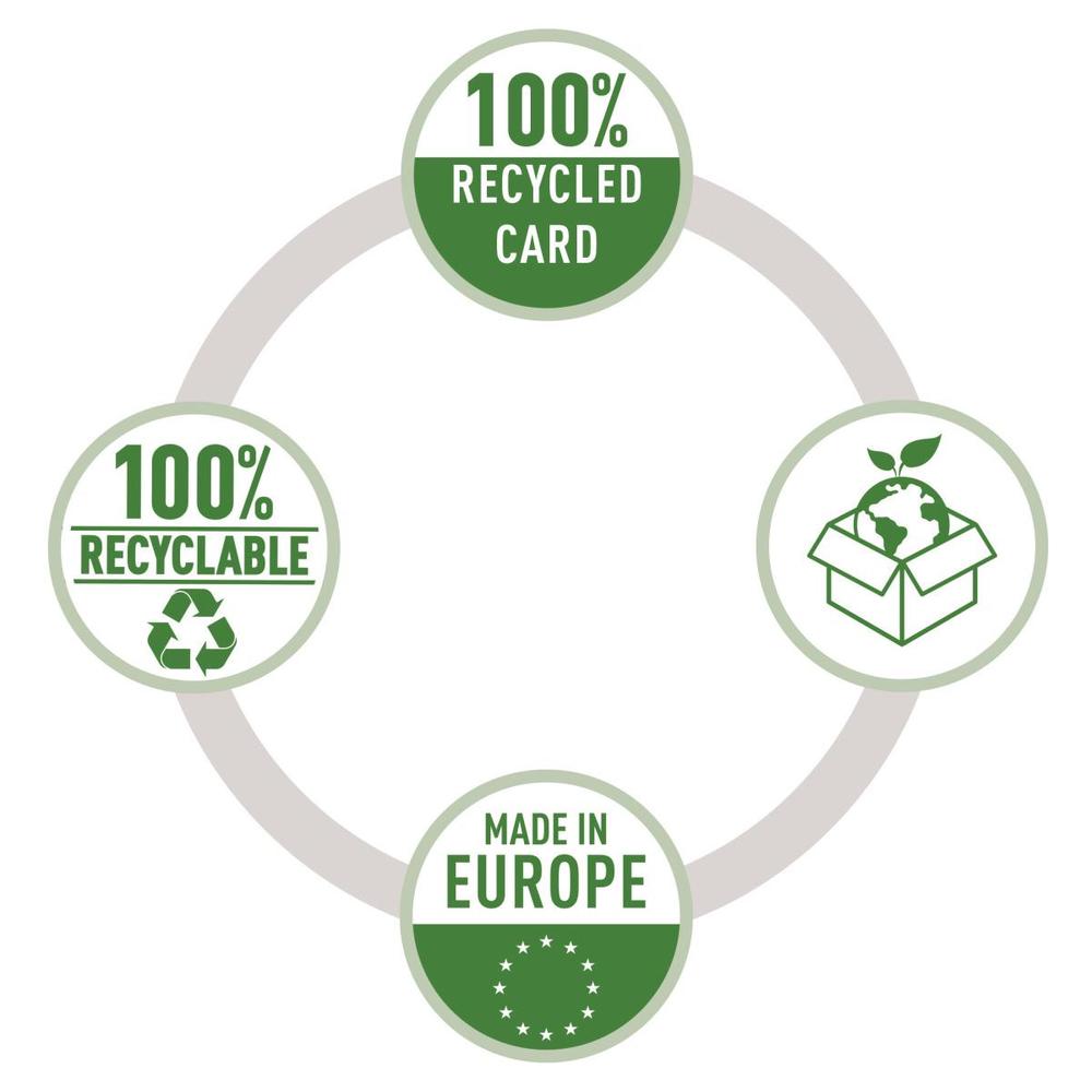 • 100% recyklovaný karton, neutrální uhlíková stopa, kompletně recyklovatelné, s ekologickou certifikací Blue Angel