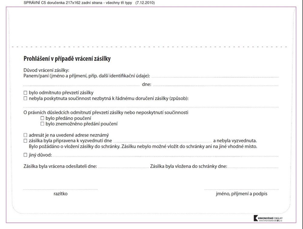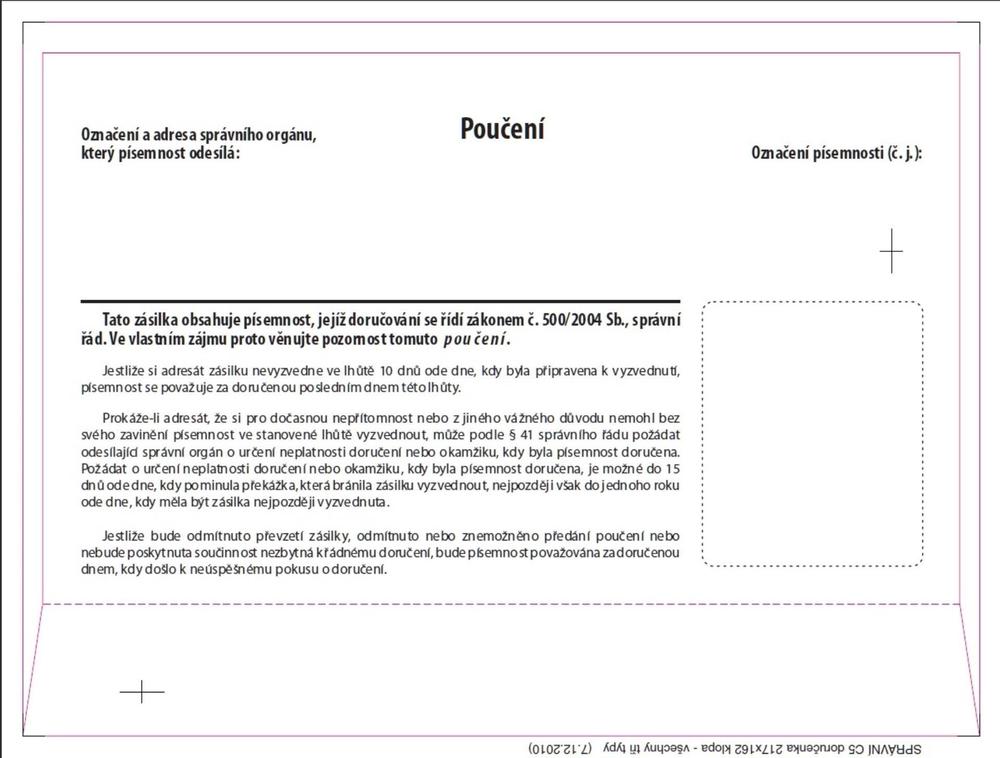 - Obálka s vytrhávací doručenkou a odtrhávacím poučením dle zákona č.500/2004 Sb.