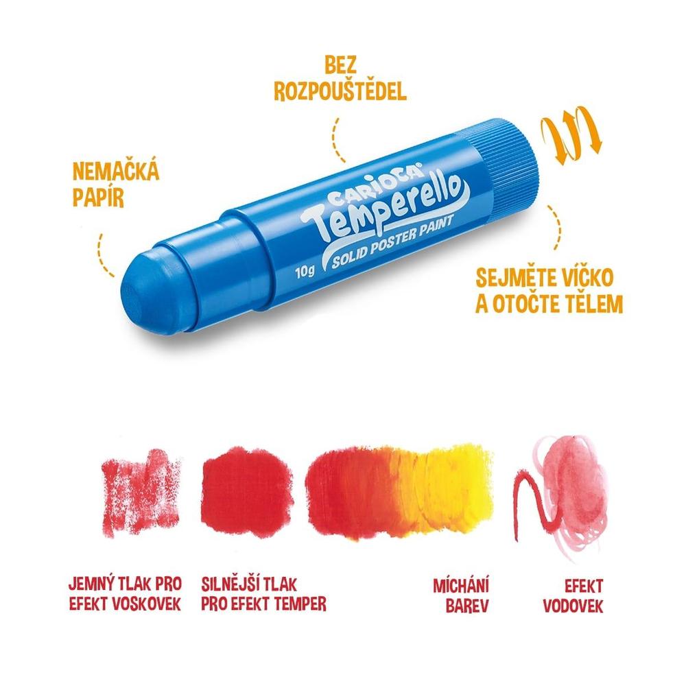 - Víceúčelové: tempery, voskovky, vodové barvy, blending efekt