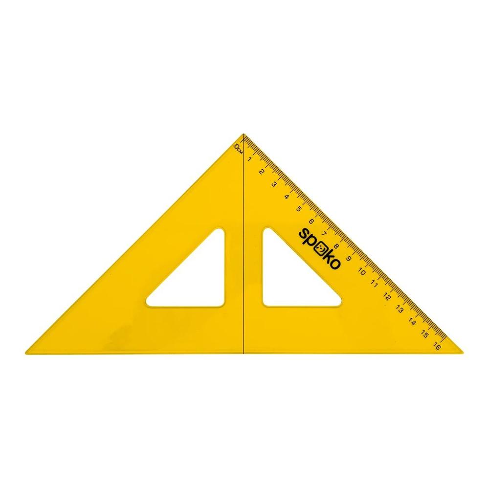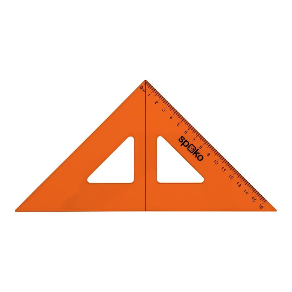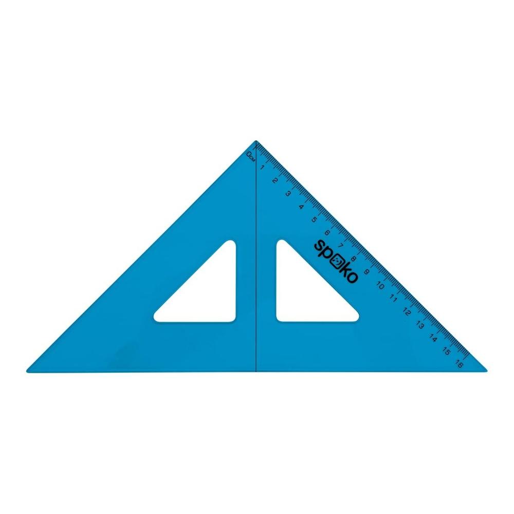 Rovnoramenný pravoúhlý trojúhelník s ryskou a předtištěnou stupnicí o délce 16 cm. Pravítko svírá úhly 45°/90°/45°. Balení s euro závěsem.