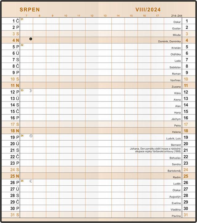 osobní záznamy, důležitá telefonní čísla, roční plánovací kalendář aktuálního roku, tabulkový kalendář aktuálního a následujícího roku, jmenný seznam, adresář