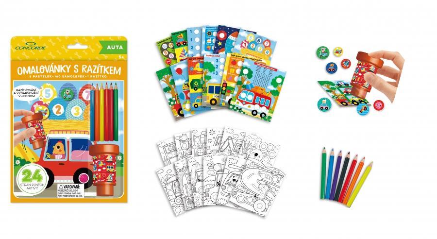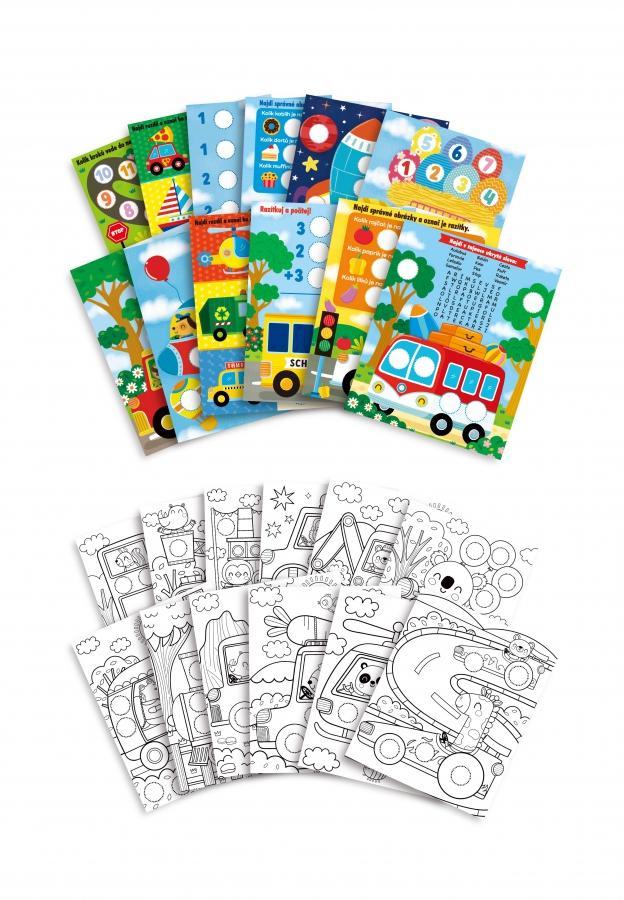 - Obsahují 24 stran plných aktivit - 12 stránek s úkoly a 12 stránek k vybarvování, 160 snadno odlepitelných samolepek s motivem aut, 1 razítko a 6 pastelek