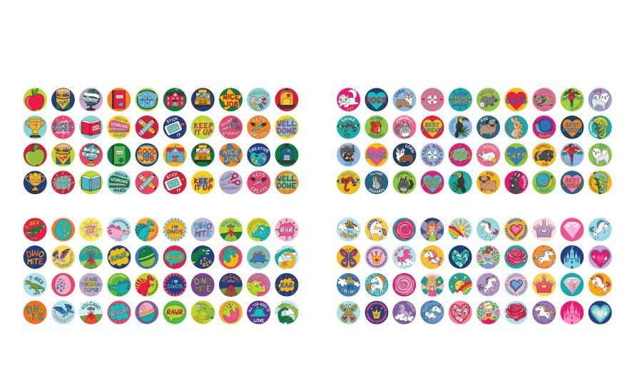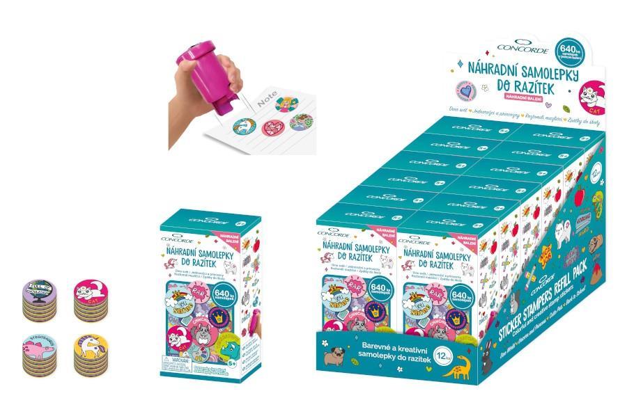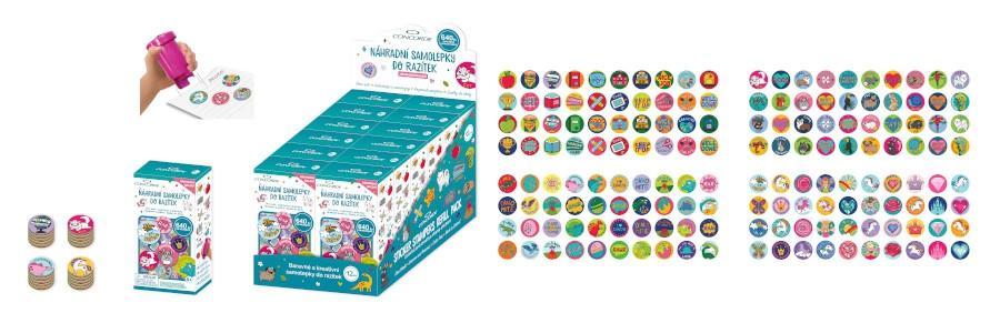 - Náhradní balení samolepek do razítek obsahuje 640 ks samolepek s pestrou nabídkou motivů, jako jsou roztomilí mazlíčci, jednorožci a princezny, dino svět a zpátky do školy