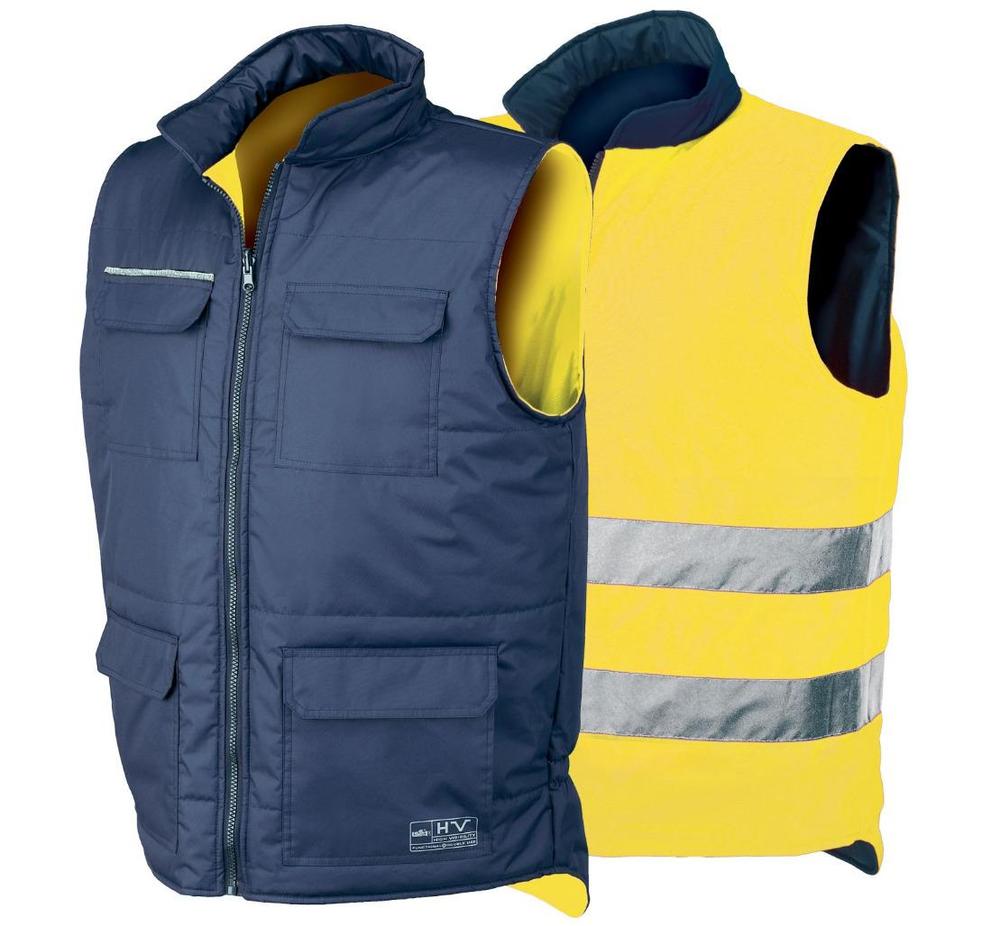 • Vlastnosti: Oboustranná vesta se čtyřmi kapsami aplikovanými na modré straně a kapsou na mobil na oranžové straně s vysokou viditelností